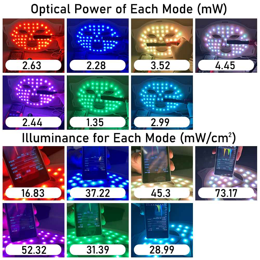 Wavelengths:620-650nmnm(Red); 440-460nm(Blue); 550-630nm(Yellow); 440-630nm(White);440-630nm(Purple);540-550nm(Green);440-550nm(Cyan);