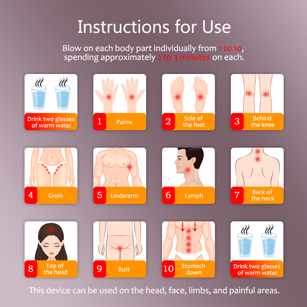 First, drink two glasses of warm water. Then, follow the numbered sequence in the diagram to blow on each body part for 2-3 minutes. This helps prevent or alleviate pain in affected areas. After completing the entire process, remember to drink two more glasses of warm water to replenish your energy.
