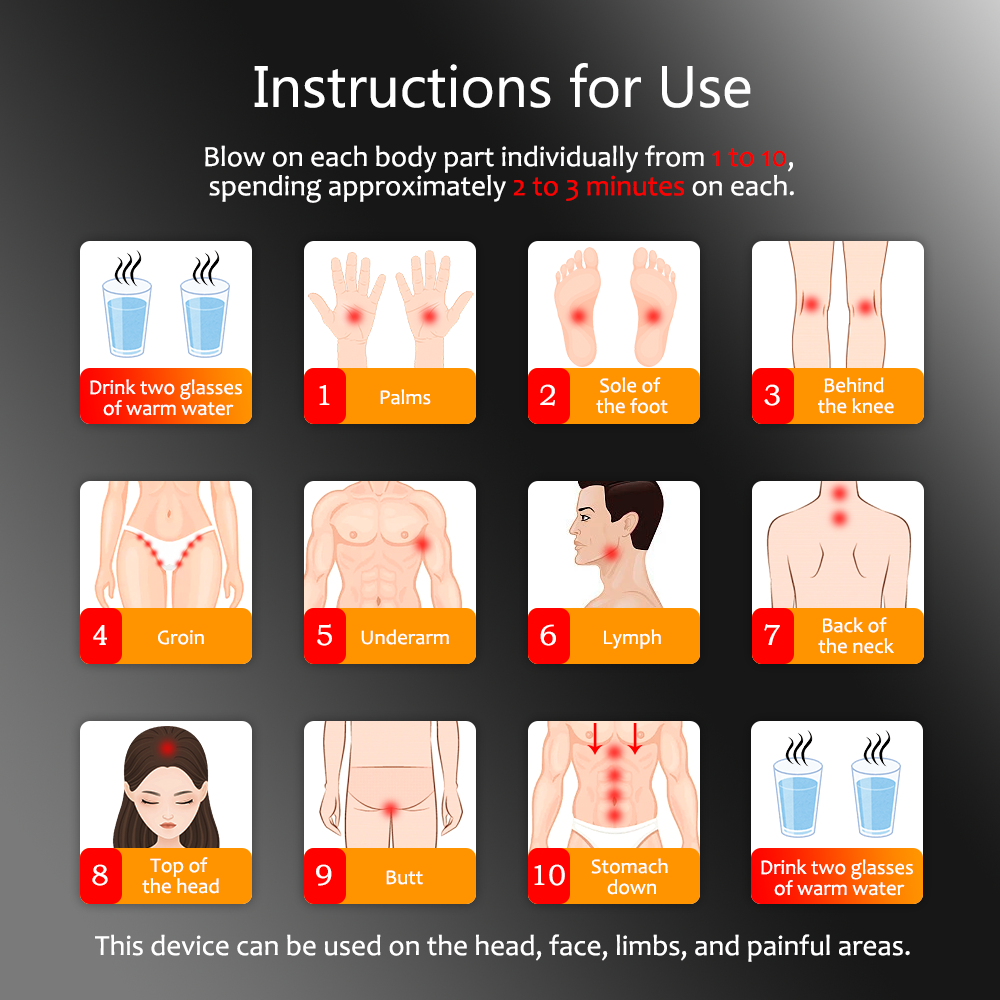 First, drink two glasses of warm water. Then, follow the numbered sequence in the diagram to blow on each body part for 2-3 minutes. This helps prevent or alleviate pain in affected areas. After completing the entire process, remember to drink two more glasses of warm water to replenish your energy.
