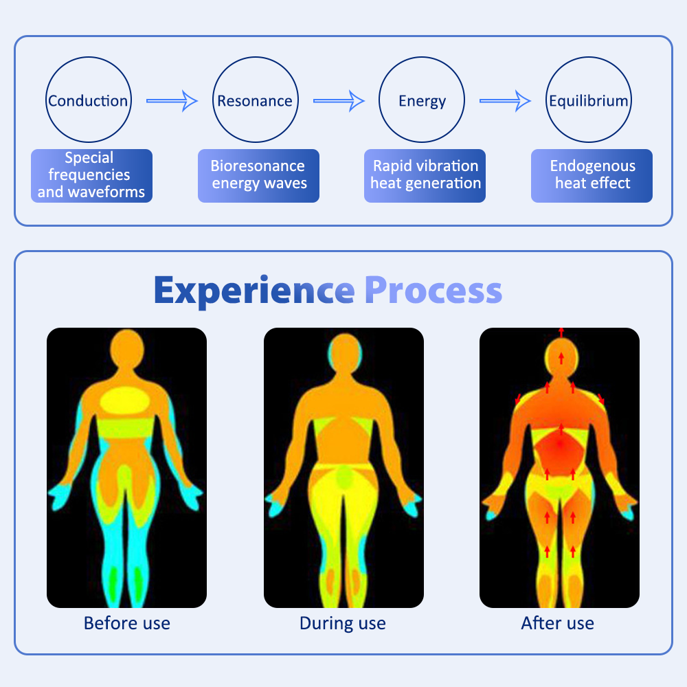 Terahertz wave energy acts on the human body, exerting therapeutic effects by heating the skin, falling under the category of physical therapy. As energy oscillations continuously penetrate from the soles of the feet throughout the body, body temperature rises rapidly. The metabolic pathways of meridians, blood vessels, cells, and internal organs are completely unblocked, allowing nutrients and oxygen to be continuously delivered to all parts of the body. Toxins and waste are excreted through sweat and urine, and body fluids are constantly replenished, thereby continuously supplementing bioelectric energy, fundamentally regulating physical constitution and improving health.
